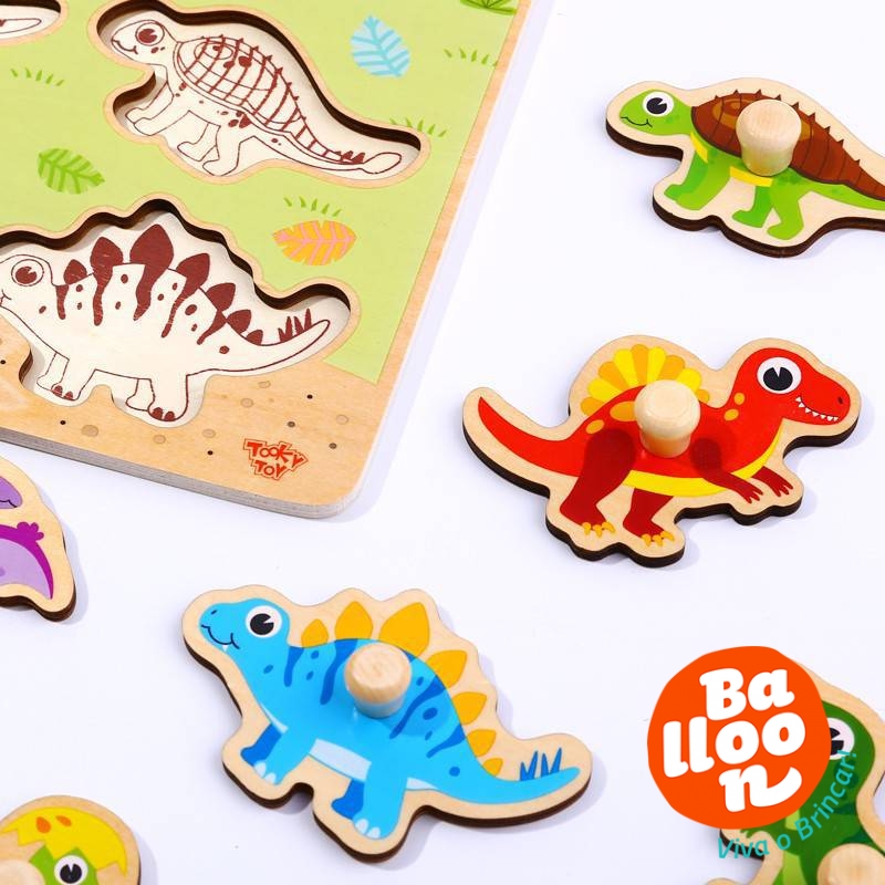 A criança associa o formato e o tamanho, visualizando ainda as figuras desenhadas no tabuleiro. É colorido, de madeira reflorestada e superatrativo para crianças que adoram dinossauros. Dá para associar vários conhecimentos em um só brinquedo.